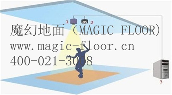 “魔幻地面”(MAGIC FLOOR)采用悬挂在顶部的投影设备把影像效果投射到地面,当使用者走至投影区域时,通过系统识别,使用者可以直接使用双脚或动作与投影幕上的虚拟场景进行交互,互动效果就会随着你的脚步产生相应的变幻。