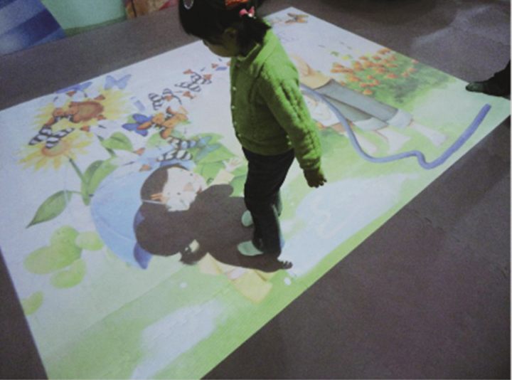 这些影像可以是一个水面、一片落叶地、一片雪地等常见的景观,当有人从投影区域上走过时,地上的影像会根据人的位置进行一些奇妙的变幻效果,例如水池里面会泛起一圈圈的涟漪,水里的小鱼则会四散躲开,地面上的落叶像被风刮走一样四散开去,雪地上留下了人的脚印。还可以在地面上投射出一个模拟的小运动场地,可两人或者多人在场地上进行踢球对抗比赛。“魔幻地面”(MAGIC LOOR)的表现效果还可以根据最终用户的需要进行定制开发。